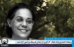 خبرگزاری هرانا – امروز ۱۵ شهریورماه ۱۴۰۴، ریحانه انصارینژاد، فعال کارگری در پی توقف اجرای حکم حبس از زندان قرچک ورامین آزاد شد.