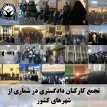 به گزارش هرانا، امروز شنبه ۱۸ دی ماه ۱۴۰۰، شماری از کارکنان دادگستری کشور دستکم در ۵۳ شهر و شهرستان مختلف از جمله دلیجان، چابهار، ارومیه، زرینشهر، یزد، ایذه، سمنان، قم، بوشهر، مبارکه، قصرشیرین، تبریز، مهدیشهر، سقز، اردبیل، آغاجاری، رزن، کرمان، شاهرود، دشتی، اهواز، کوثر، ورامین، لاهیجان، تهران، گنبدکاووس، نهاوند، تربت حیدیریه، اراک، جوانرود، لنجان، ابرکوه، ایلام، بهاباد، رودسر، مریوان، شهرکرد، نیکبخت، خانمیرزا، بهمئی، قدس، کرمانشاه، ملایر، ساوه، کهنوج، چناران، بیرجند، اسلام آباد غرب، آذرشهر، بندرعباس، بابلسر، میامی و شیراز، دست به تجمع اعتراضی زدند.