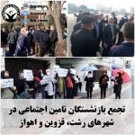 به گزارش اتحادیه آزاد کارگران ایران، امروز یکشنبه ۲۶ دیماه ۱۴۰۰، شماری از بازنشستگان و مستمریبگیران تأمین اجتماعی در شهرهای کرمانشاه، خرمآباد، اهواز، رشت و قزوین در مقابل ساختمان تامین اجتماعی شهر خود و در تهران مقابل مجلس دست به تجمع زدند.
