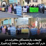 همزمان شورای بازنشستگان ایران از تجمعات این بازنشستگان در شهرکرد، کرمان، خرم آباد، بروجرد، مریوان، تهران، زنجان و ساری خبر داد.