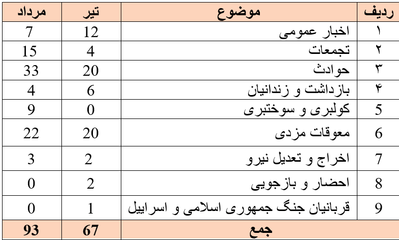این گزارشات آماری از میان بیش از 93 خبر در طول مرداد ماه 1404 تهیه شده است.