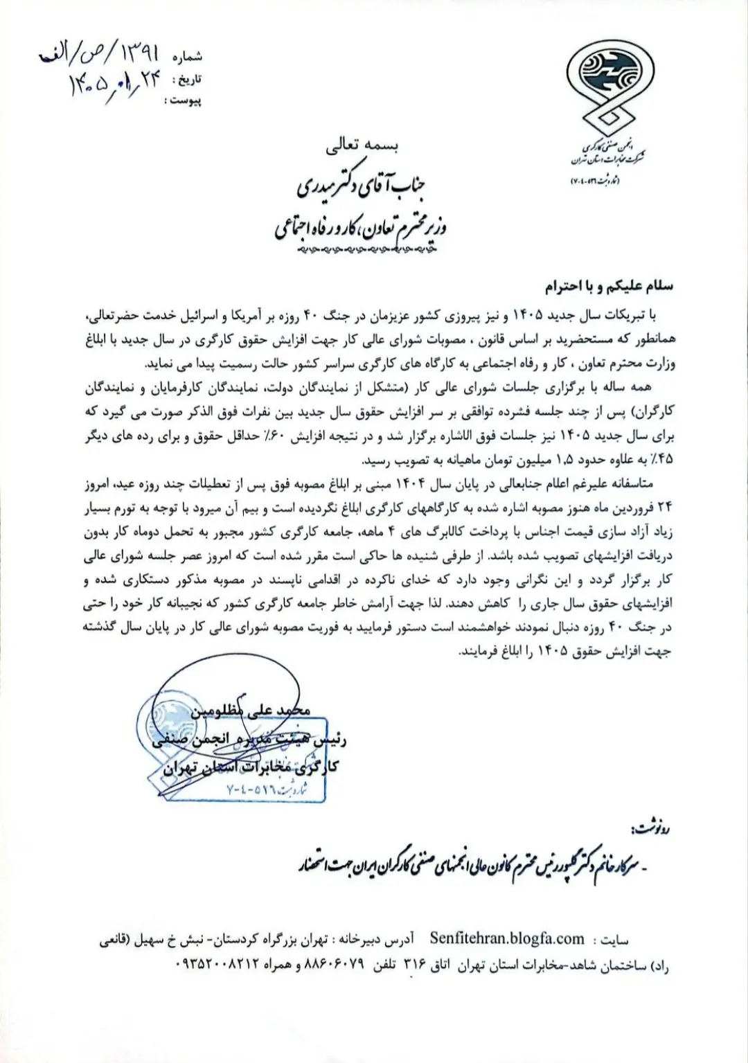 در این نامه بر لزوم ابلاغ فوری مصوبه پایانی سال شورای عالی کار در مورد افزایش حقوق های کارگری ۱۴۰۵ تاکید شده است.